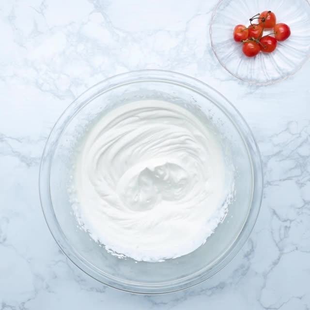 5.カラフルクリームを作る。別のボウルに生クリームを入れて泡立て器で5分立てまで泡立て砂糖を加えてさらに泡立てる。1/3の量を取り出しかき氷シロップの赤、残りに青のかき氷シロップを加えて混ぜる。