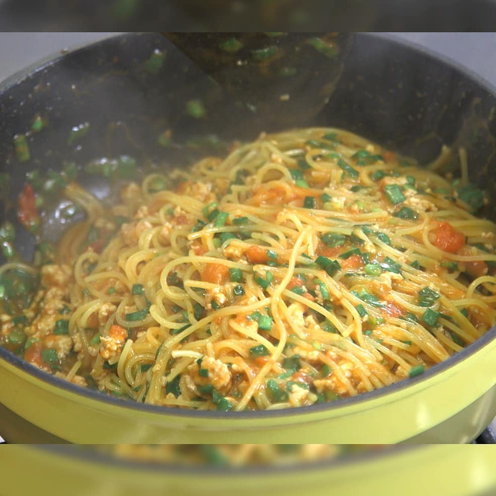 ⑥パスタが茹で汁を吸い、茹で上がったら火を止め、刻んだニラとオリーブオイルをひとまわし加えて混ぜ、器に盛る