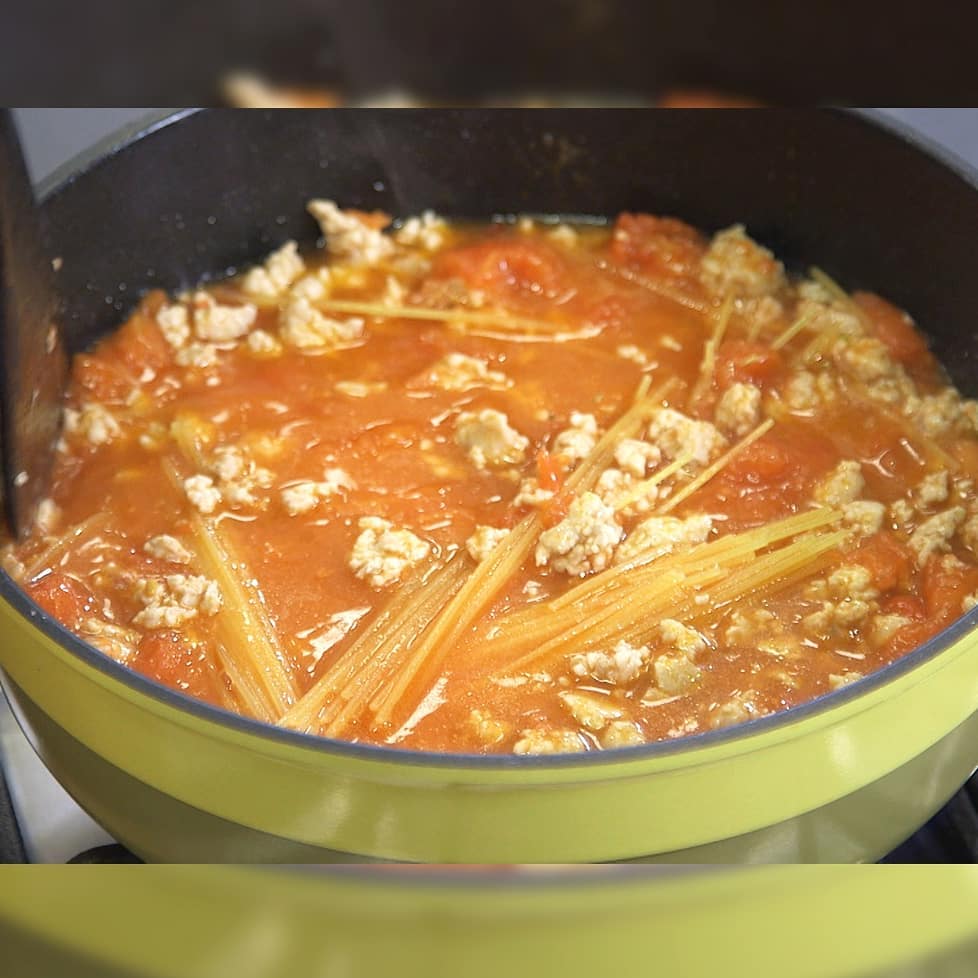 ④パスタ 1.4mm 200gを半分に折り、中火で6分煮込む