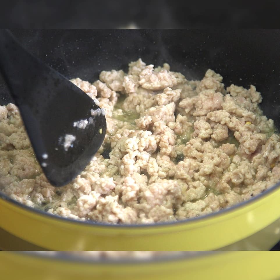①鍋にオリーブオイル大さじ1を熱し、鶏ひき肉300gを加えて炒める