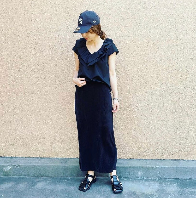 美しいデコルテラインが程良くて、ボリューミーな襟元で華やかな印象に仕上がりますね😘キャップでカジュアルダウンも、技あり👏甘さを取り入れつつ、テイストミックスを狙うのもGOODです👍是非、チェックしてみてくださいね💁♀️💕