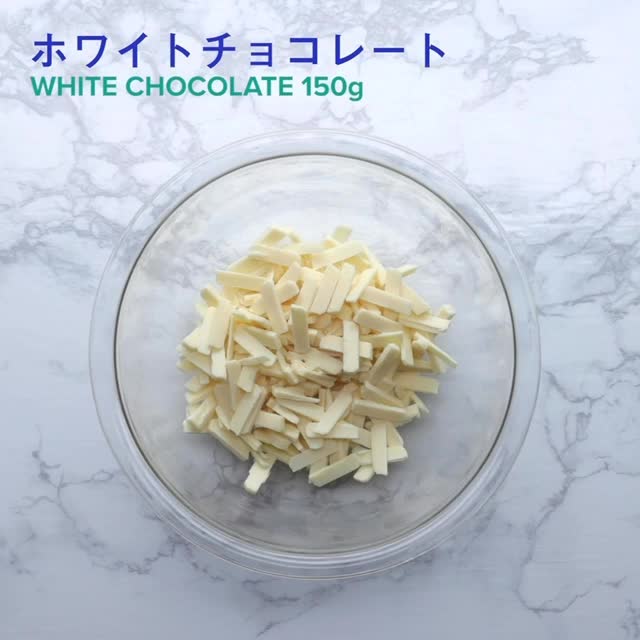 7.ボウルにホワイトチョコレートを入れて(6)を加え、泡立て器でなめらかになるまで混ぜ、ザルで濾して2等分にする。