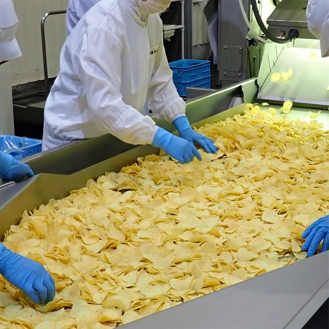 揚げ油には、風味のよい国産の米油を配合しました。揚げ上がったポテトチップスに焦げなどがないか、機械と人の目で検品しています。