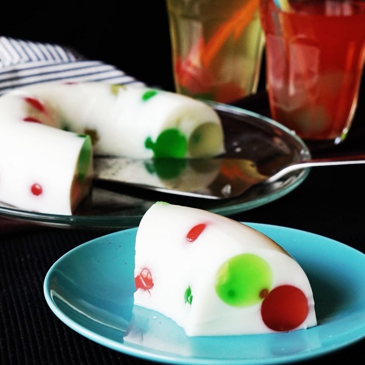 5. ケーキ型(今回は20cmのエンゼル型)に寒天ボールを色がなるべく被らないようにランダムに入れ、《カルピスゼリー》注ぐ。冷蔵庫に入れて、再度2時間ほど固める。 #おうちカフェ #料理 #cooking #レシピ#delish #yummyfood #homemadefood #nomnom #ilovefood #instacook #instafood
