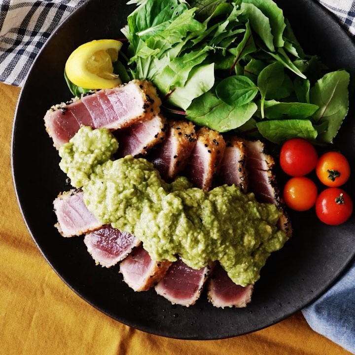 4. お皿にミックスリーフをのせ、適当な大きさにカットしたマグロカツをのせたら、アボカドソースをかける。好みでレモンをかけても♪ #おうちカフェ #料理 #cooking #レシピ#delish #yummyfood #homemadefood #nomnom #ilovefood #instacook #instafood #おうちご飯 #おうちごはん #昼ごはん #ランチ #晩ごはん #夜ごはん