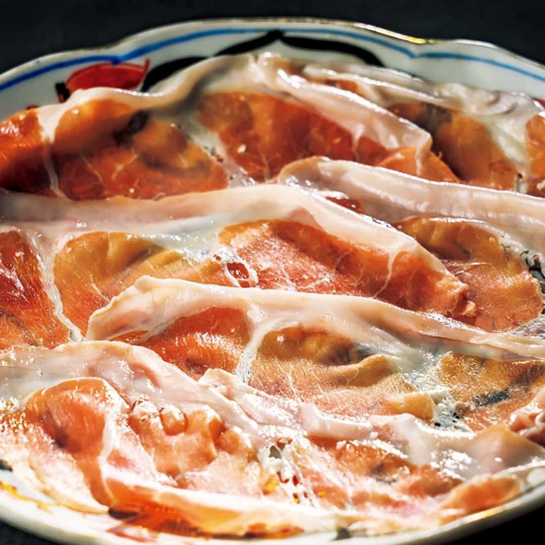 切りたてのたっぷりなパルマ産24ヶ月熟成の「生ハム」は、コースの最初に登場。
