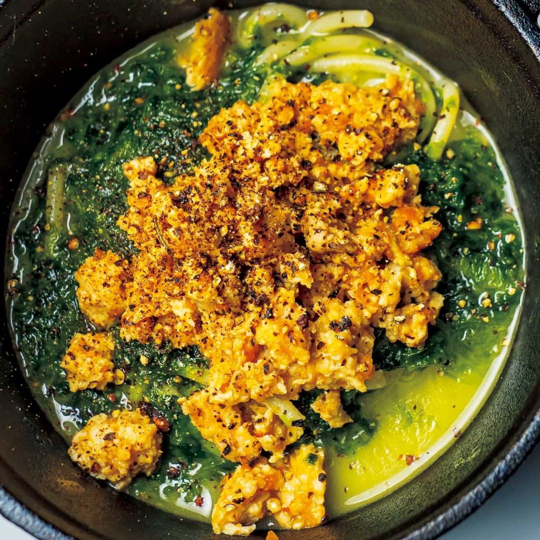 大山鶏の出汁とパスタ、海苔を合わせた後、鶏ひき肉のボロネーゼで旨みをプラス