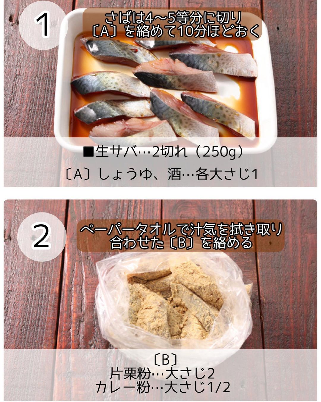 ➋ペーパータオルで、サバの余分な水気を拭き取り、合わせた〔𝙱〕をまぶす。(ポリ袋に入れ、上下にふるようにすると、まんべんなくまぶせます)