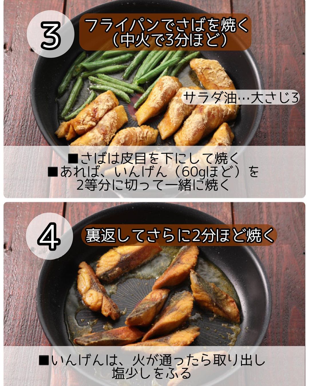 ➍サバを裏返し、さらに𝟸分ほど焼く。全体に火が通ったら、取り出す。4を器に盛り、3のいんげんを添えて、お召し上がりください♪