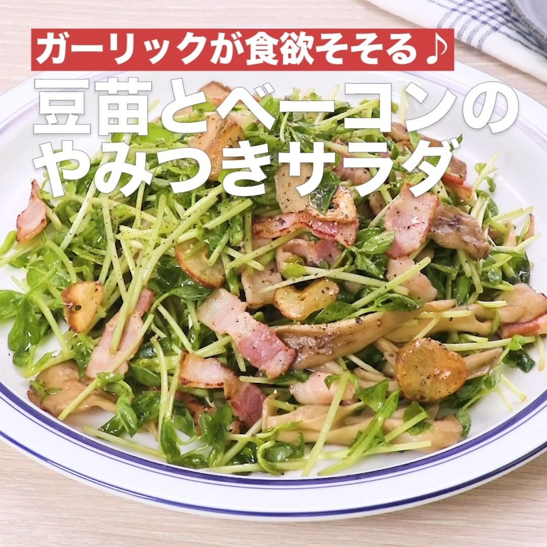 ①<ガーリックが食欲そそる♪豆苗とベーコンのやみつきサラダ>