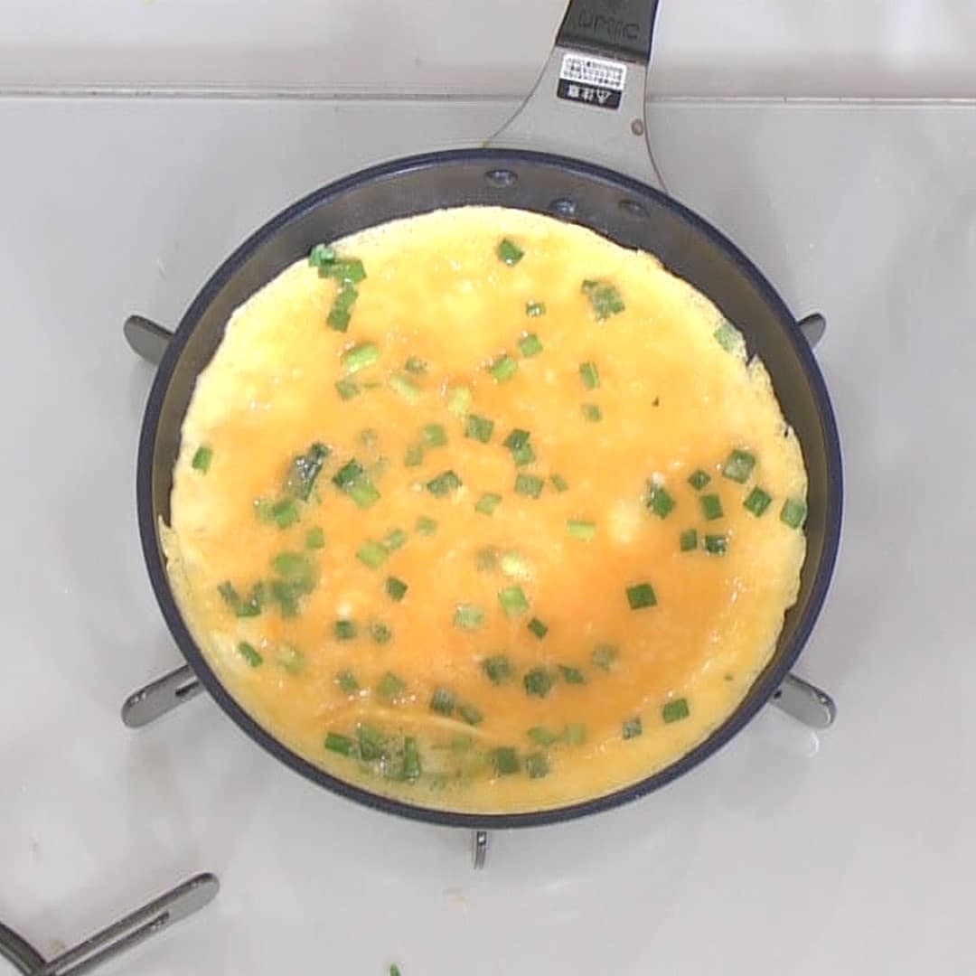 ⑤ ボウルに卵(2個)白だし(適量)を入れ、ゴムベラで切るように混ぜ、ニラ(適量)も加え卵液を作る。