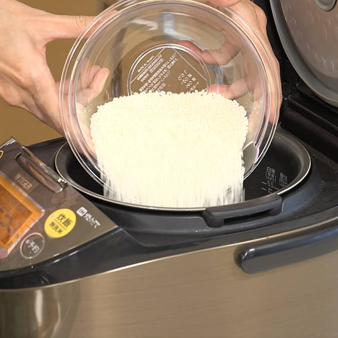 ② さらに、コンソメ(小さじ2)付属のオリーブオイル(大さじ1)を入れ、水を2合の目盛りまで入れて炊く