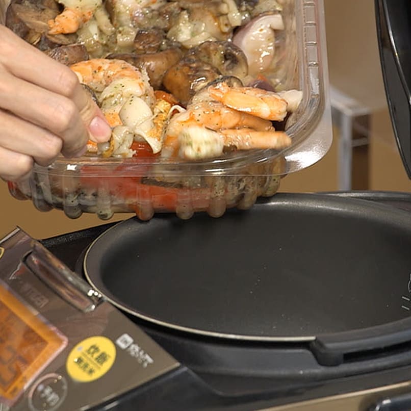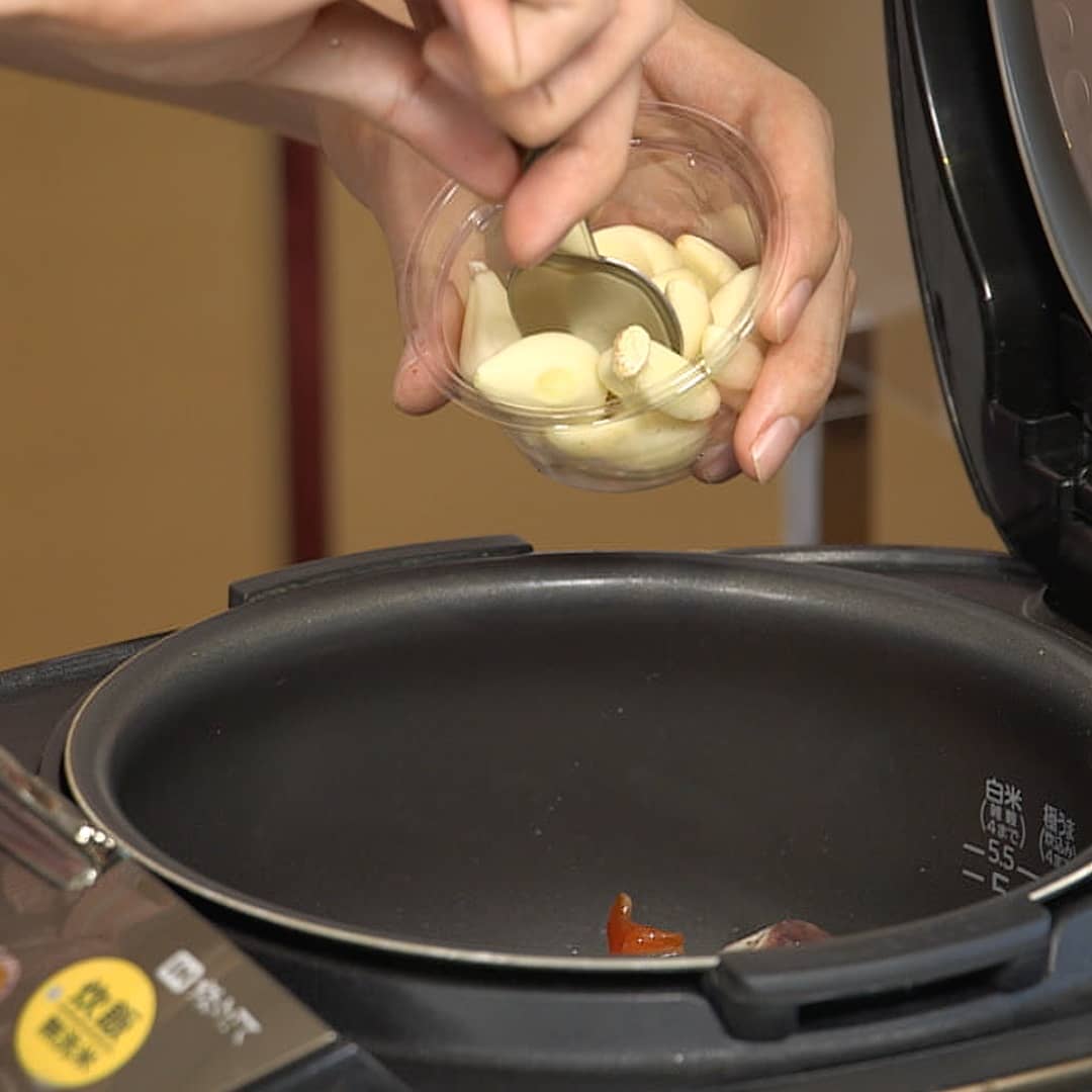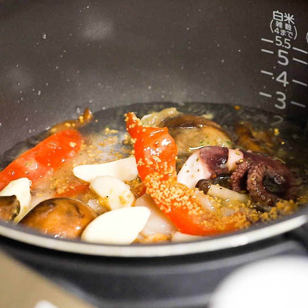 ① 炊飯器に米(2合)その上にシーフードアヒージョ(パッケージの半分・約500g)と付属のニンニク(7片)を入れる