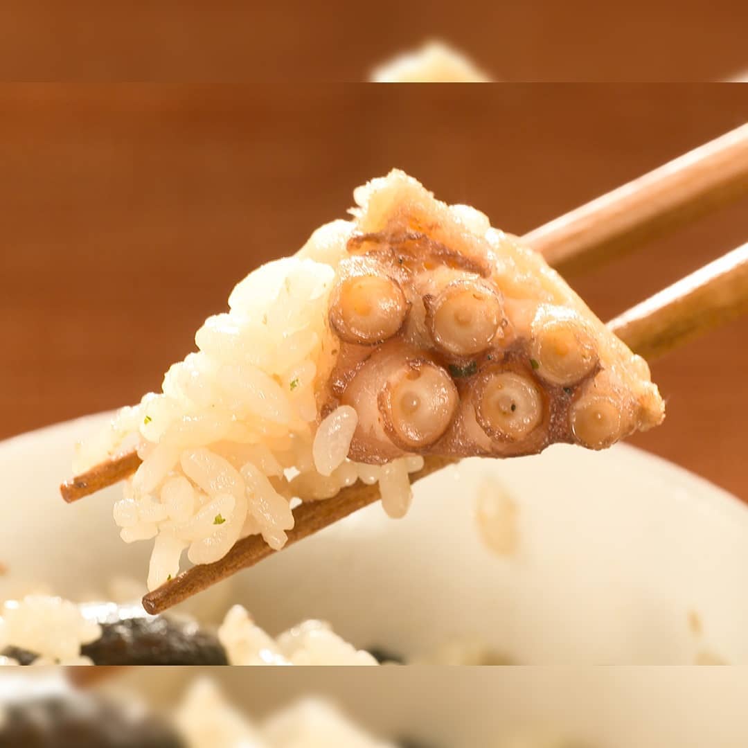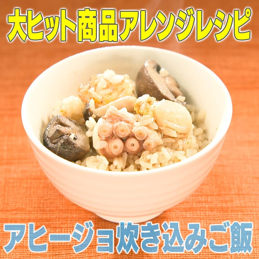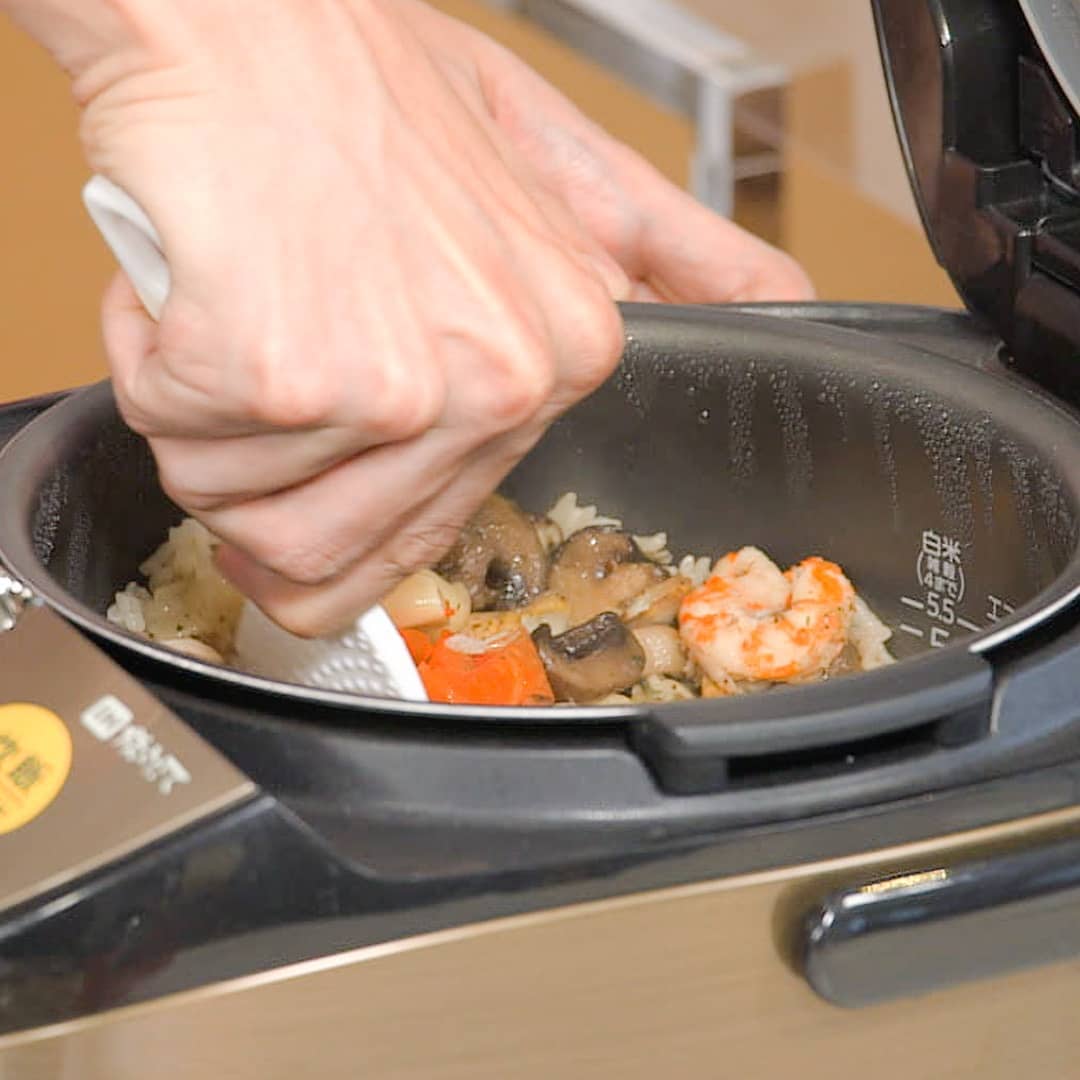 ① 炊飯器に米(2合)その上にシーフードアヒージョ(パッケージの半分・約500g)と付属のニンニク(7片)を入れる