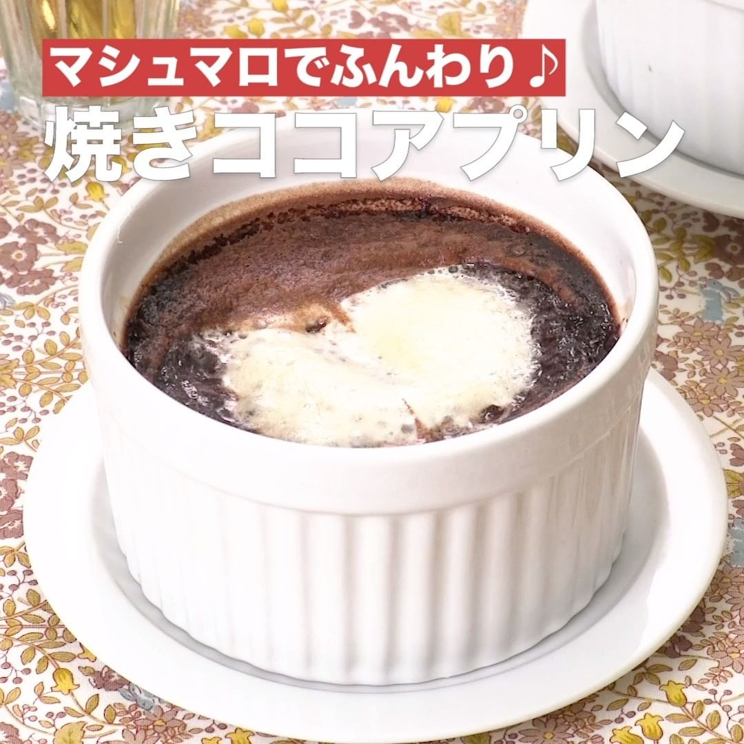 (2)耐熱ココットに1を1/2量ずつ流し入れ、マシュマロを2個ずつのせる。