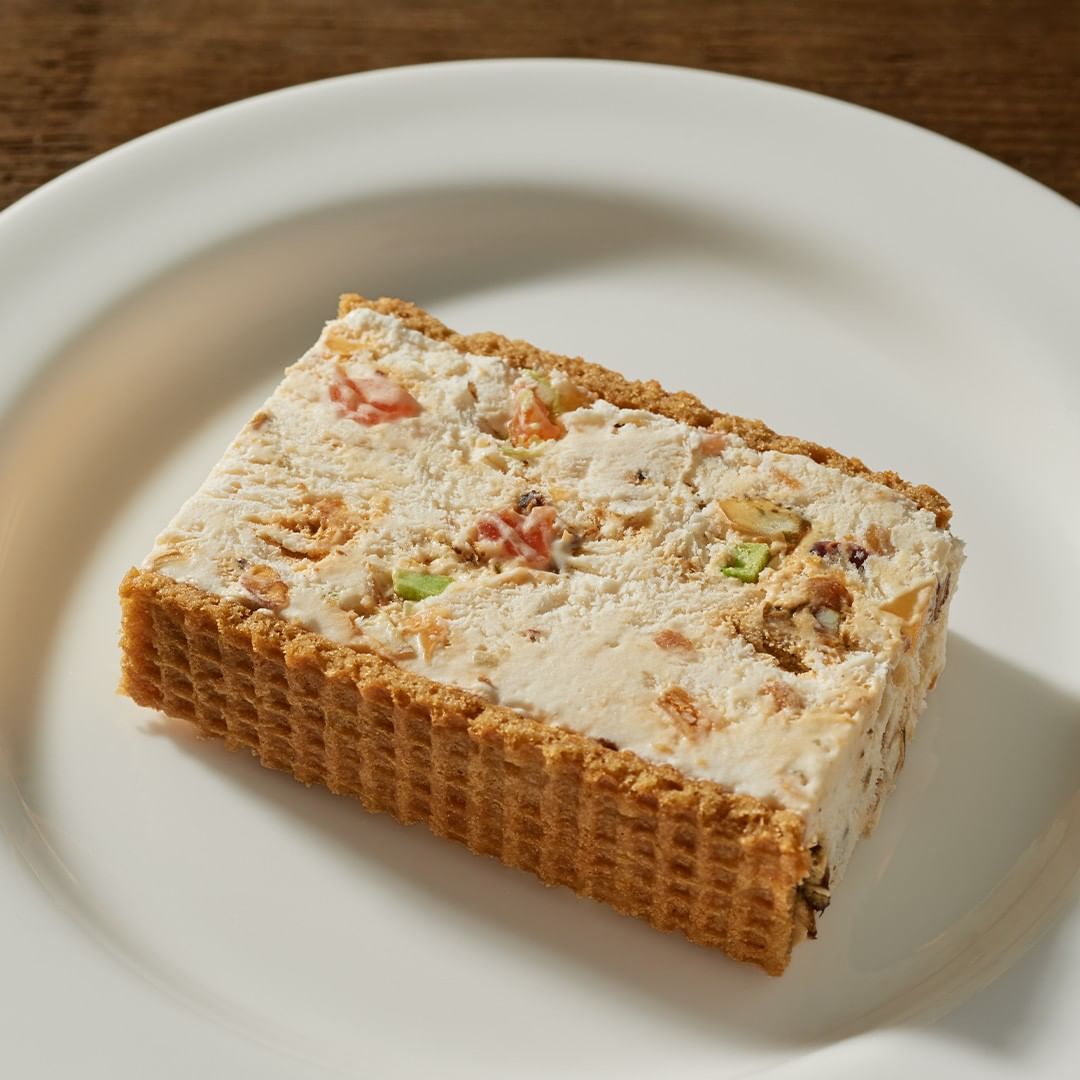 ナッツやドライフルーツと、クローバーから採った蜂蜜をたっぷりいれたヌガーグラッセをゴーフレット生地ではさみました。ほどよい甘さと、食感が特長です。クローバー蜂蜜は、渥美シェフのレストランでも使用しています。