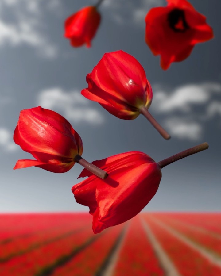 ‘Our Strong Red Lalibela’ (Onze Sterke Rode Lalibela) is a composition of images that were captured in the west region of the Netherlands, an incredible location for discovering bold and beautiful flowers. Red, the colour of the Lalibela, has associations with a wide range of symbolic meanings – love, war, vigour and life. All of these connotations have deep historic roots reflected by the top colour of the Dutch national flag and flower, the tulip. To celebrate this history, the freshly cut Red Lalibela is suspended in zero gravity, thereby encouraging viewers to admire the true beauty of these flowers while also considering the deeper symbolic meaning behind them.