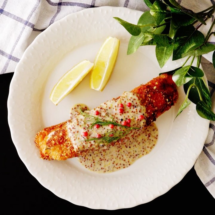 5. キツネ色になったら取り出し、最後にマスタードソース、ピンクペッパー、ディルを飾り付けたら完成! #おうちカフェ #料理 #cooking #レシピ#delish #yummyfood #homemadefood #nomnom #ilovefood #instacook #instafood #おうちご飯 #おうちごはん #昼ごはん #ランチ #晩ごはん #夜ごはん
