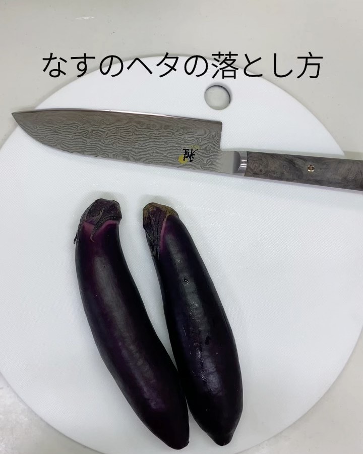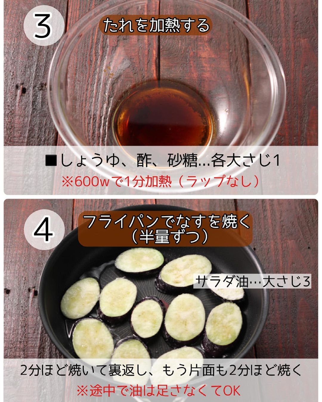 ➋フライパンにサラダ油をひいて中火で熱し、袋から出したなすを半量並べる。𝟸分ほど焼いて焼き色がついたら裏返し、さらに𝟸分ほど焼く。全体に焼き色がついたらペーパータオルなどの上に取り出して油をきる。残りも同様に焼く。