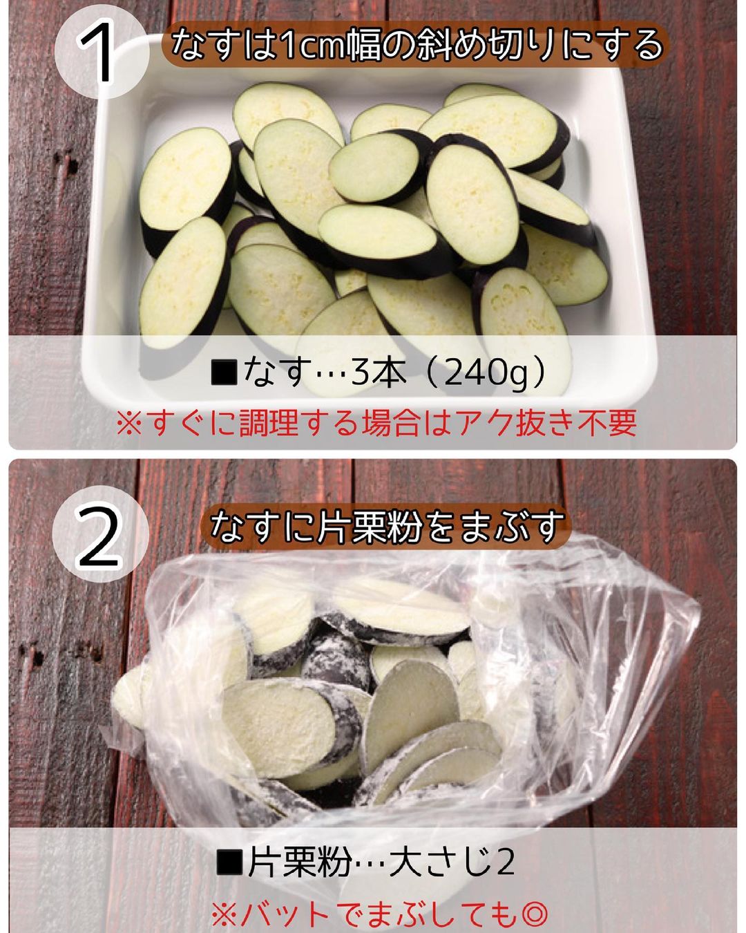 ➊なすは𝟷𝚌𝚖幅の斜め切りにし、片栗粉とともにポリ袋に入れて上下にふり、粉をまぶす。耐熱ボウルに〔𝙰〕を入れ、ラップをせずに電子レンジ(𝟼𝟶𝟶𝚠)で𝟷分ほど加熱する。