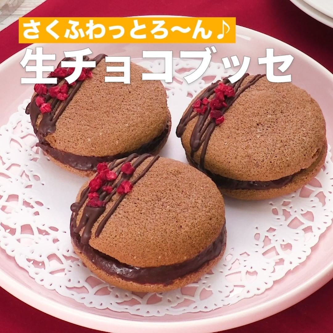 ココアのブッセ生地で生チョコを挟んだ贅沢スイーツレシピをご紹介!見た目も可愛いので、バレンタインなどのイベントにぴったりのレシピです。お口の中でとろける生チョコがたまらないおいしさ♪