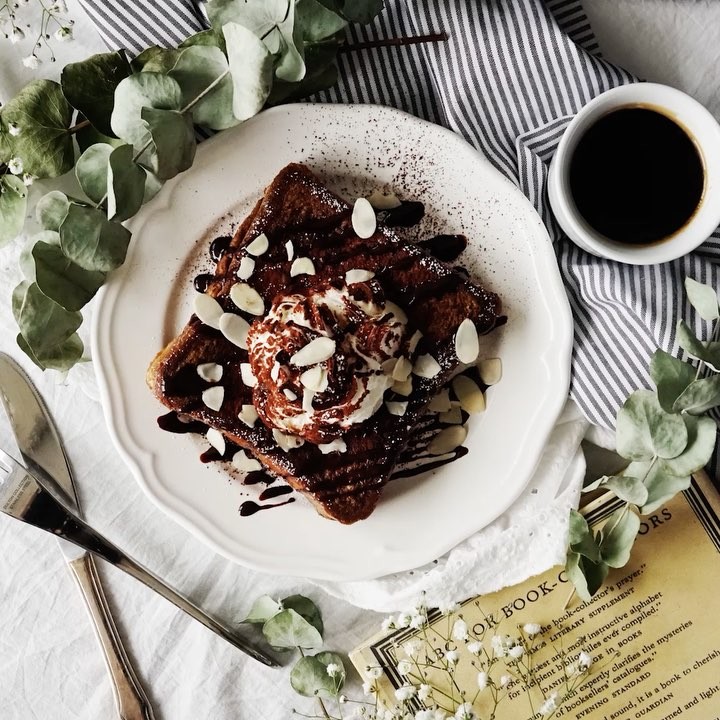6.皿に移し、ホイップクリーム→ココア→粉糖→チョコレートシロップ→アーモンドスライスをトッピングする  #おうちカフェ #料理 #cooking #レシピ#delish  #yummyfood #homemadefood  #nomnom #ilovefood #instacook #instafood