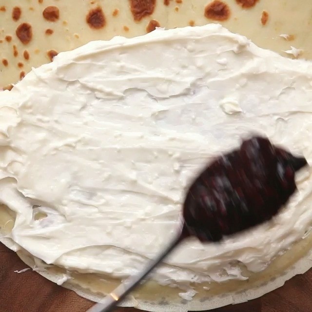 3. (2)をクレープの半分に塗り、その上に(1)をのせる。