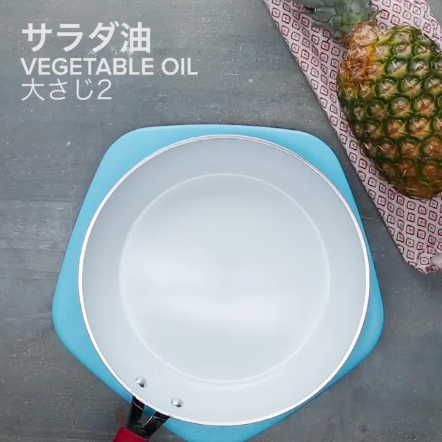 6.米酢、砂糖、ケチャップ、(2)のパイナップル1カップを加えて炒め合わせる。⁣