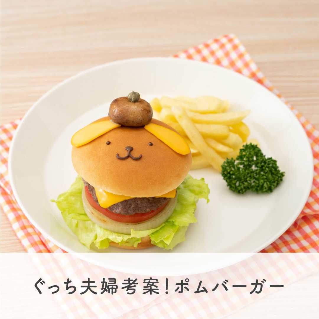 ぐっち夫婦考案!ポムバーガーのご紹介です。バンズにチョコレートペンでポムポムプリンの顔を描き、可愛らしいハンバーガーに仕上げています。彩りよく、具だくさんで食べごたえも抜群なので、ランチやパーティーにもおすすめの一品ですよ。ポムポムプリンの表情をアレンジして、自分だけのハンバーガーを作ってみてくださいね。