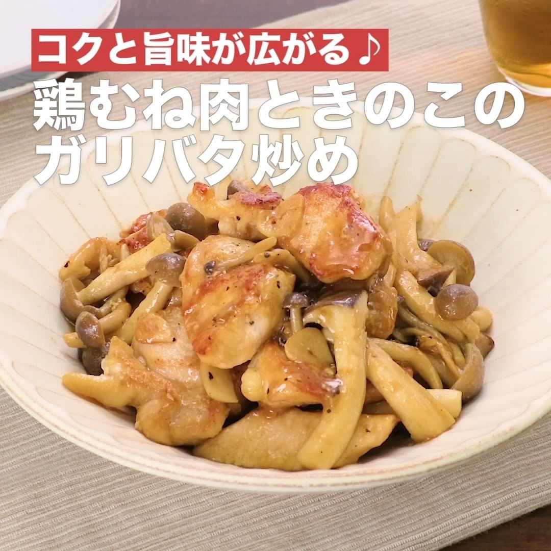 ⑧<コクと旨味が広がる♪鶏むね肉ときのこのガリバタ炒め>