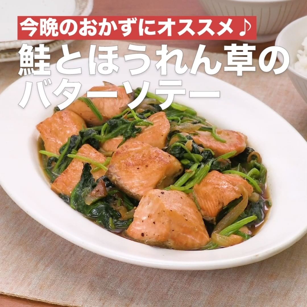 香ばしく焼いた鮭でごはんが進む一品のご紹介!ふんわりとバターが香るほうれん草ソテーと鮭の相性が抜群♪シンプルな素材が味を引き立てます。味付けは醤油だけで味わい深く旨味がたっぷり♪葉物野菜を変えてみたり、きのこを加えたアレンジも楽しんでみて下さい!
