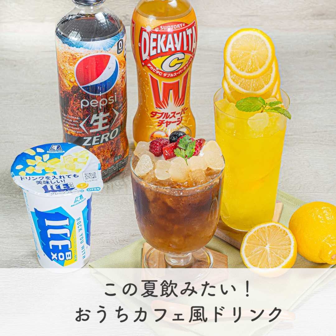 この夏飲みたい!おうちカフェ風ドリンクのご紹介です。「ICEBOX グレープフルーツ」と「ペプシ<生>ゼロ」を使用したドリンクは飲みごたえもありながら、見た目もかわいいフロートレシピです。マシュマロと牛乳を混ぜるだけで簡単に作れるアイスは、驚きやおもしろさがあり、お子様と楽しみながらお作りいただけますよ。「ICEBOX グレープフルーツ」と「デカビタC ダブルスーパーチャージ」を使用したドリンクは、レモンを丸ごと使用していて爽快感あふれる1杯に仕上がっています。暑い夏にぴったりのドリンクでおうちカフェをお楽しみくださいね。