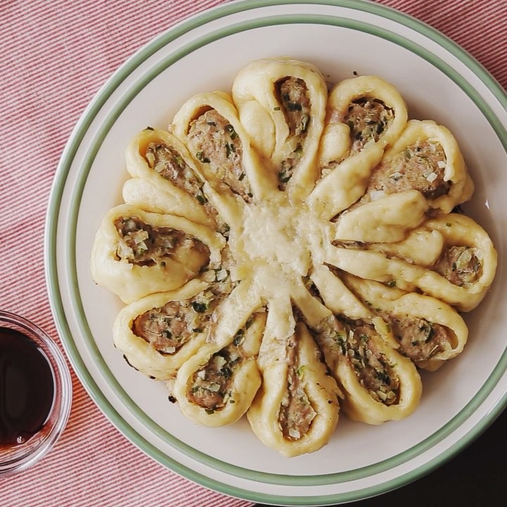 4. パン生地を直径30cmの丸型に伸ばす。中心にタネを丸く乗せたら、パン生地をタネを包み込むように折りたたみ、ひっくり返してフライパンの直径に合わせて伸ばす(今回は20cm)。中心5cmを残し、放射線状に12箇所切り込みを入れる。フライパンに移動し、切り込みを入れた生地を90度ねじる。フライパンを中火にかけ、1分ほど加熱をしたら、お湯を周りから流し、蓋をして弱火で20分加熱する。パチパチと水分が飛んだ音がし始めたら、蓋を開けて中火にし、ごま油を周りから流しいれ、香りが立ってきたら完成!そのままでも、お好きな餃子のつけだれを付けても美味しいですよ。