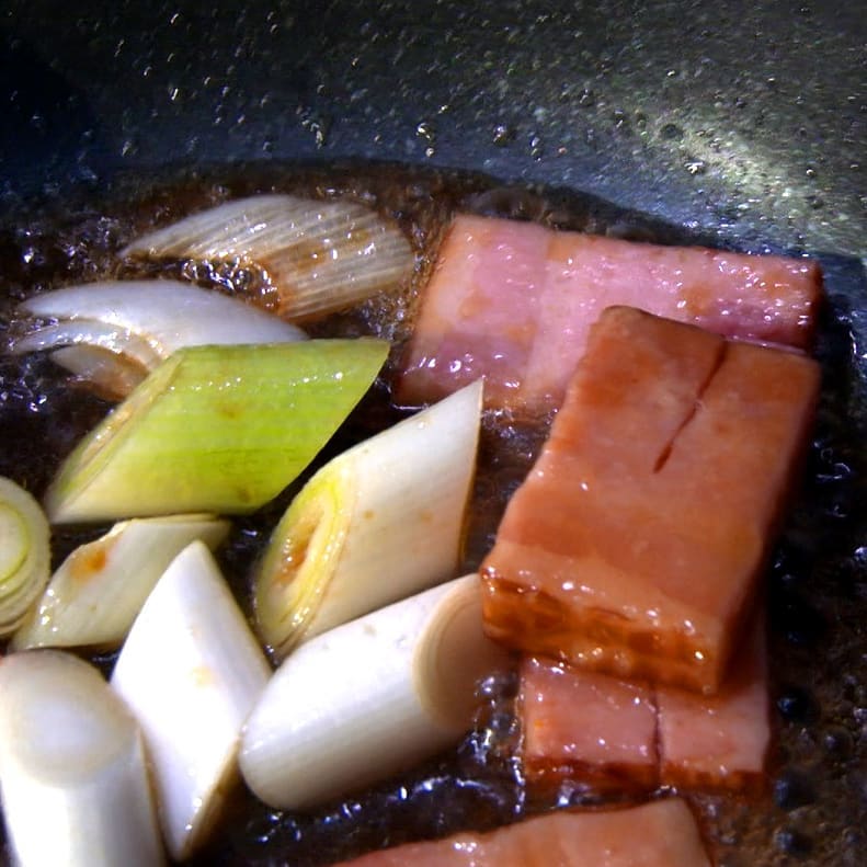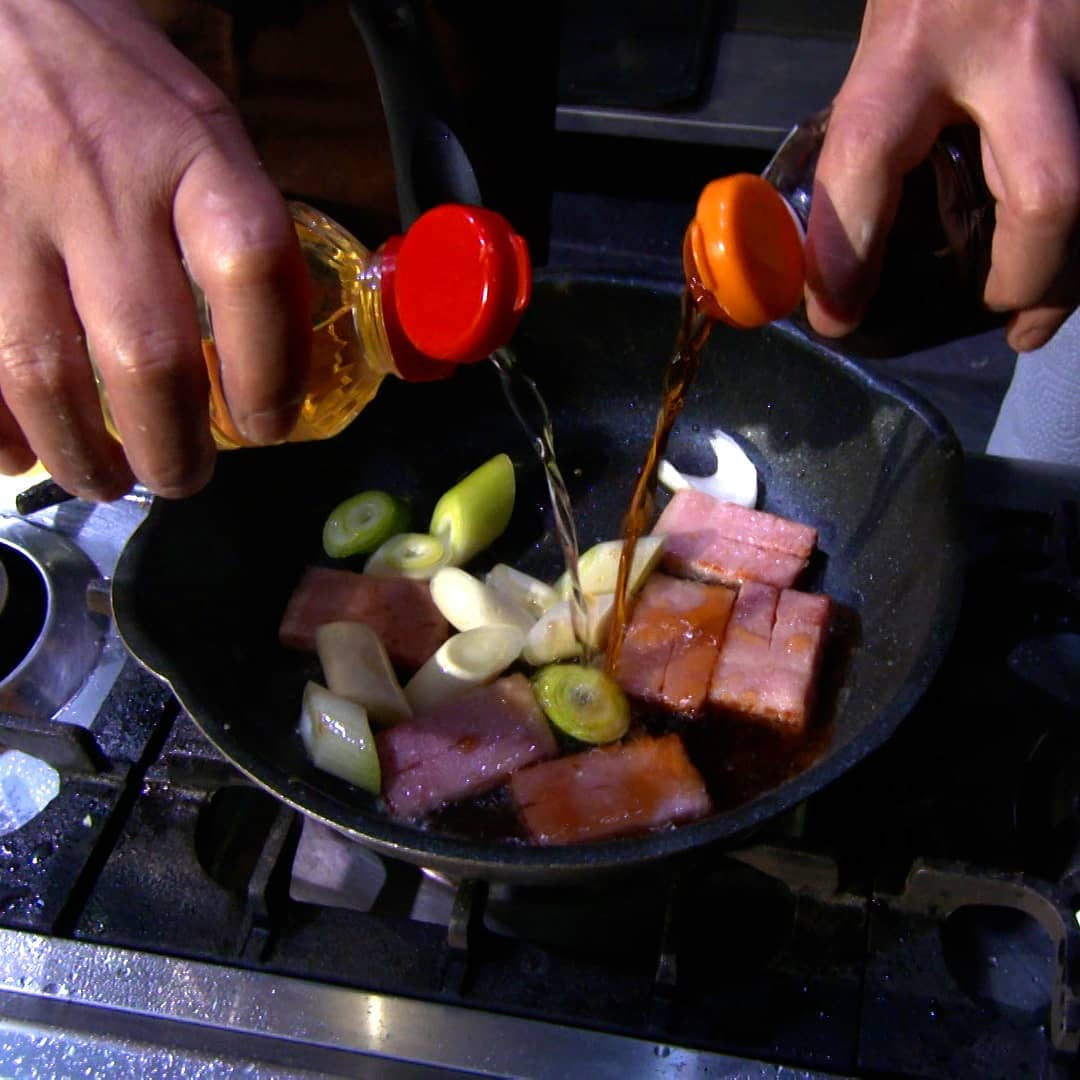 ④ みりん、めんつゆ(2倍濃縮)ウスターソース(いずれも適量)を加え煮込む