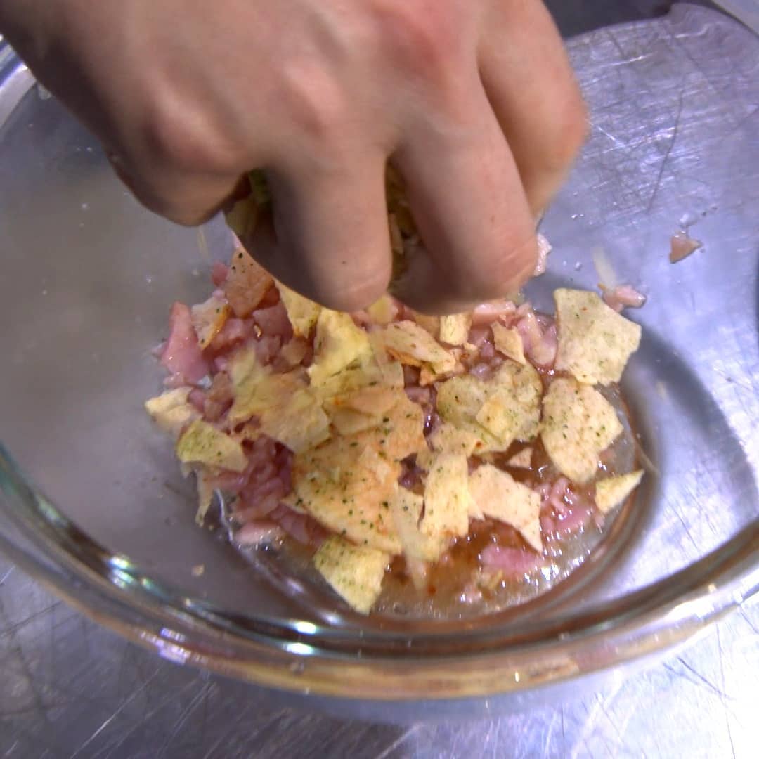 ② ボウルに和風ドレッシング(適量)焼いたベーコン(①)さらにポテトチップス(のり塩)を砕き、オリーブオイルで混ぜ合わせソースを作る