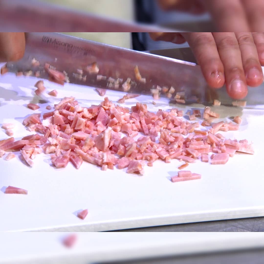 ① フライパンにオリーブオイルをひき、みじん切りにした薄切りベーコン(3枚)、ニンニクチューブ(適量)を焼く。