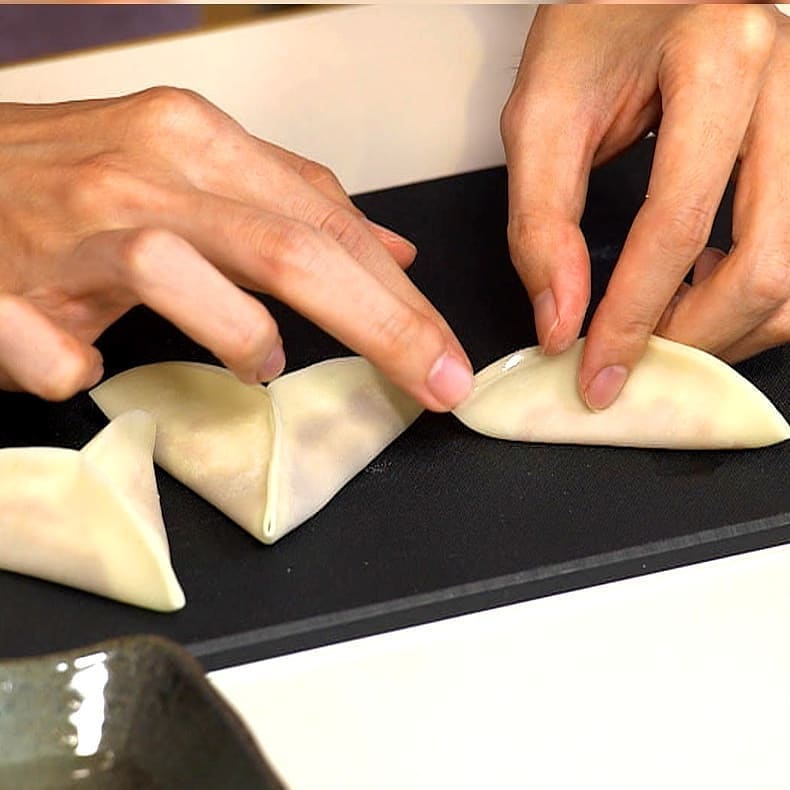 ②皮の端に水をつけ、3辺から中心に向け折り包んで形を整える【三角包み】