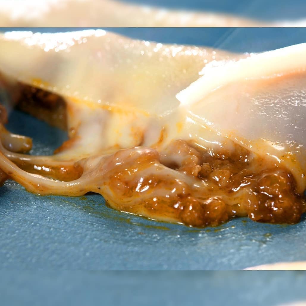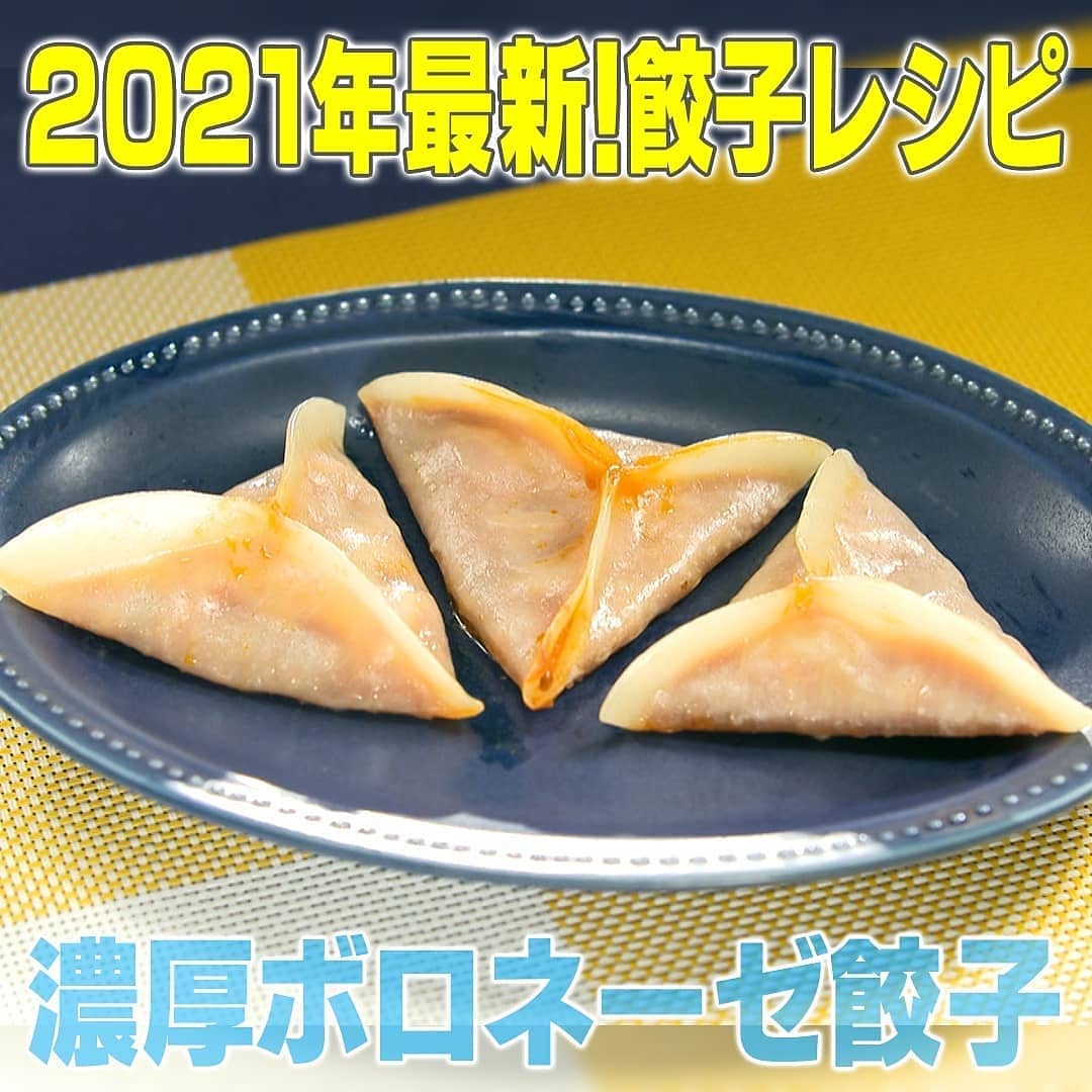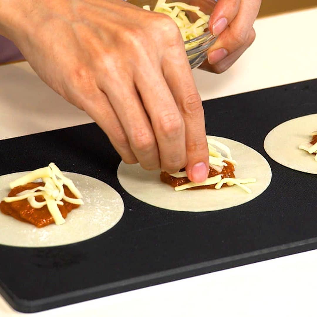 ①餃子の皮(1枚)に市販のボロネーゼソース(小さじ2)ピザ用チーズ(ひとつまみ)をのせる