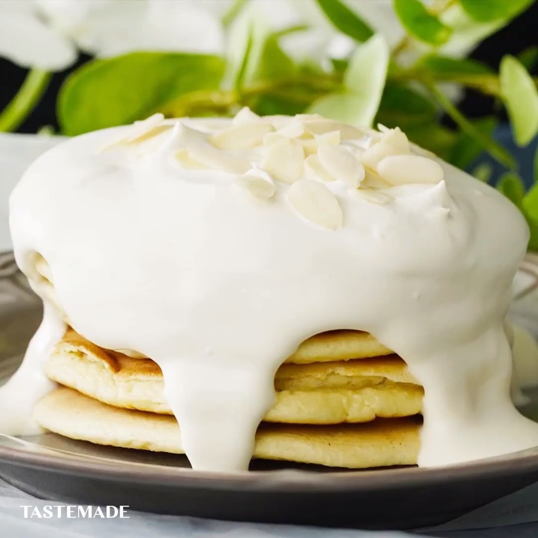 生地にもトッピングのクリームにもアーモンドミルクを加えているので、ナッツの風味がたっぷり!はちみつやメープルシロップとは一味違う白いソースで、いつもとは違うパンケーキが楽しめます🥞