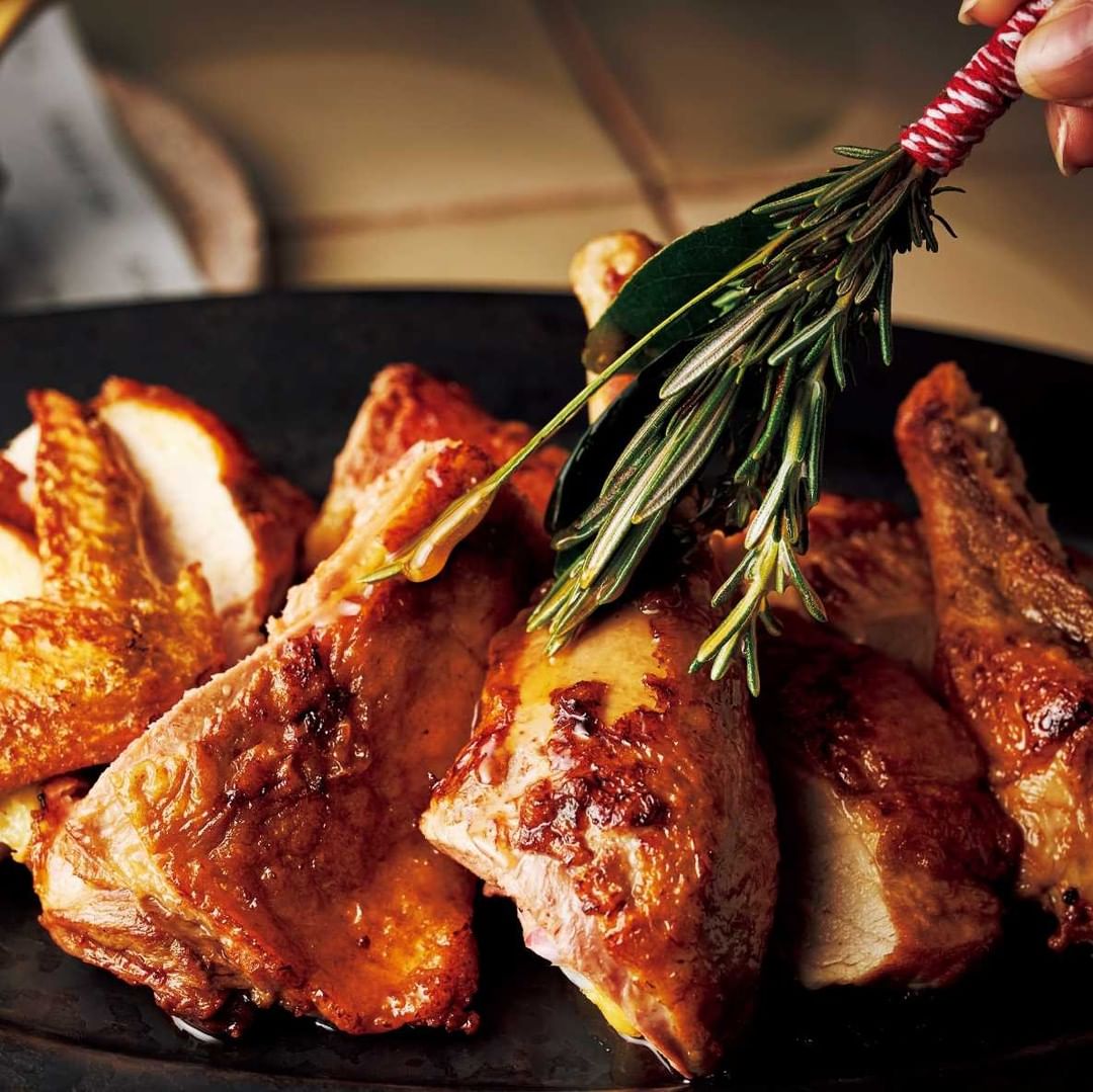 ローリエやタイムを結んだ刷毛でソースを塗り、ハーブの香りを纏わせていただく。鶏のストックを煮詰めたソース付き