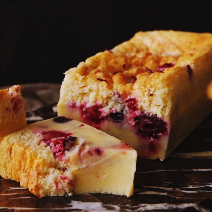 4. ②に③を加えて、ざっくりと合わす。メレンゲの粒が大きく残っている状態でOK。クッキングシートを敷いたケーキ型に流し入れ、ベリーミックスを散りばめたら、オーブン140℃で50分焼く。粗熱が冷めた後、冷蔵庫で冷やして完成!