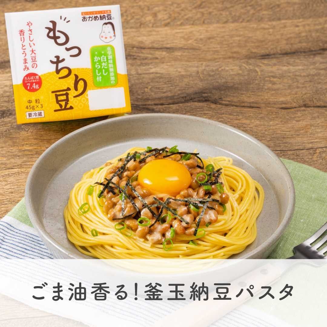 ごま油香る!釜玉納豆パスタのご紹介です。ゆでたてのパスタに合わせた「もっちり豆」の旨み、ごま油の香ばしさが食欲をそそり、まろやかな卵黄がおいしい一品です。シンプルなパスタなので、「もっちり豆」のやさしい大豆の甘みともっちり食感が味わえますよ。とても簡単にできて、麺ランチにぴったりです。