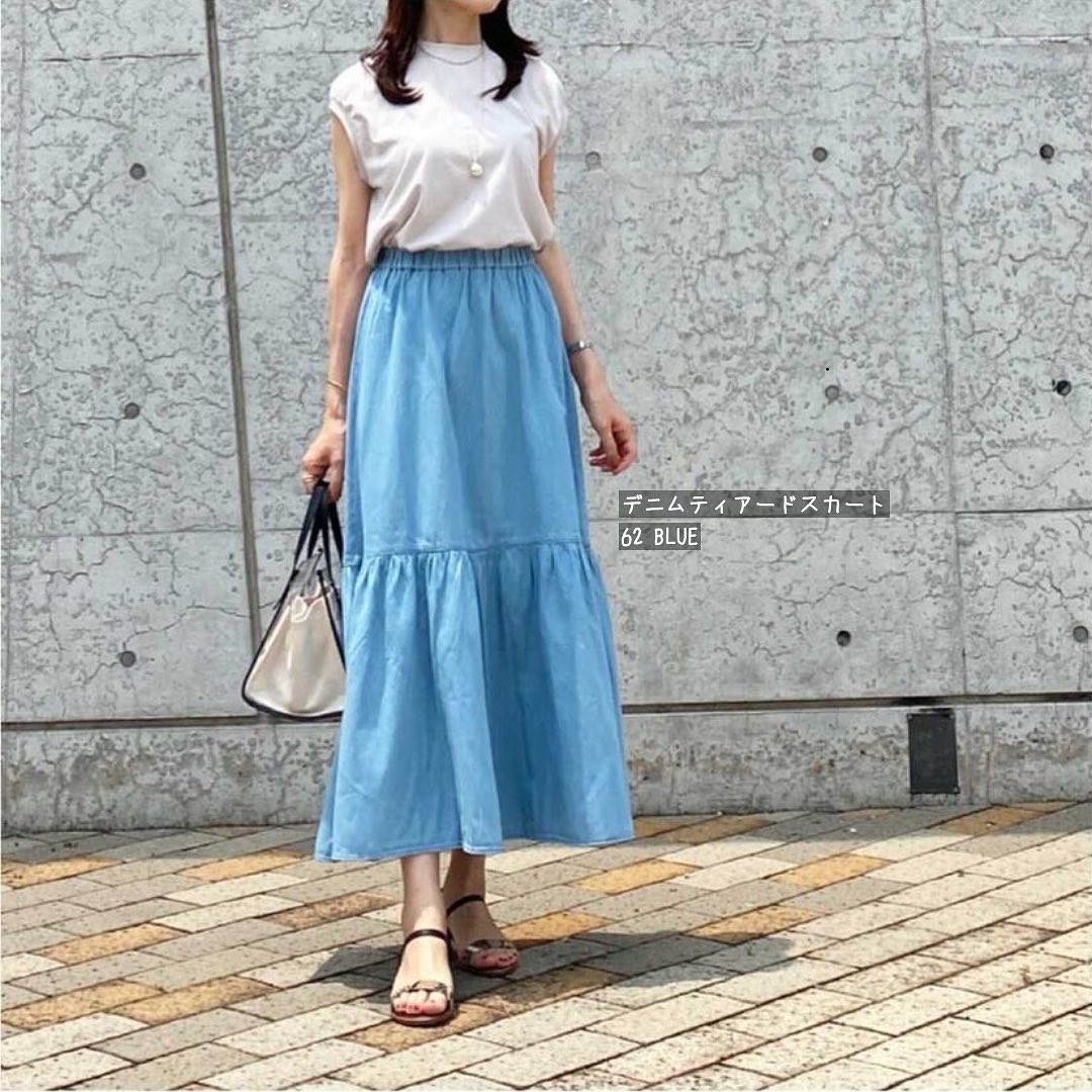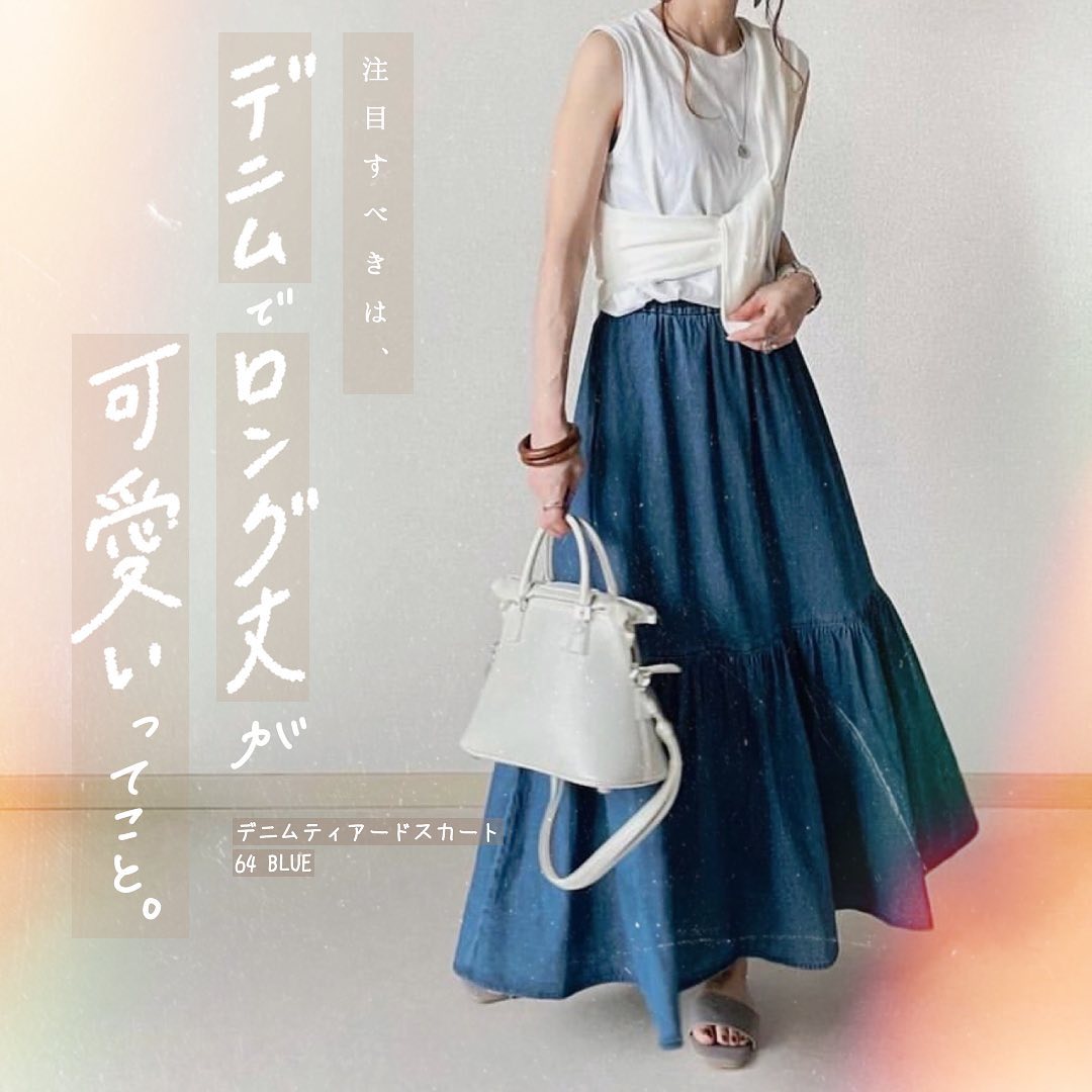 注目すべきは、デニムでロング丈が可愛いってこと🥰ライトオンスのデニム生地で仕立てた、ティアードデザインが愛らしい、トレンドのスカート👌柔らかく、ウエストゴム仕様で着心地抜群✨程よいフレア感も、着るだけでワクワクしちゃいますね😘シンプルなトップス合わせでも、こなれ感のある大人カジュアルスタイルに👍是非、チェックしてみてくださいね😊💕