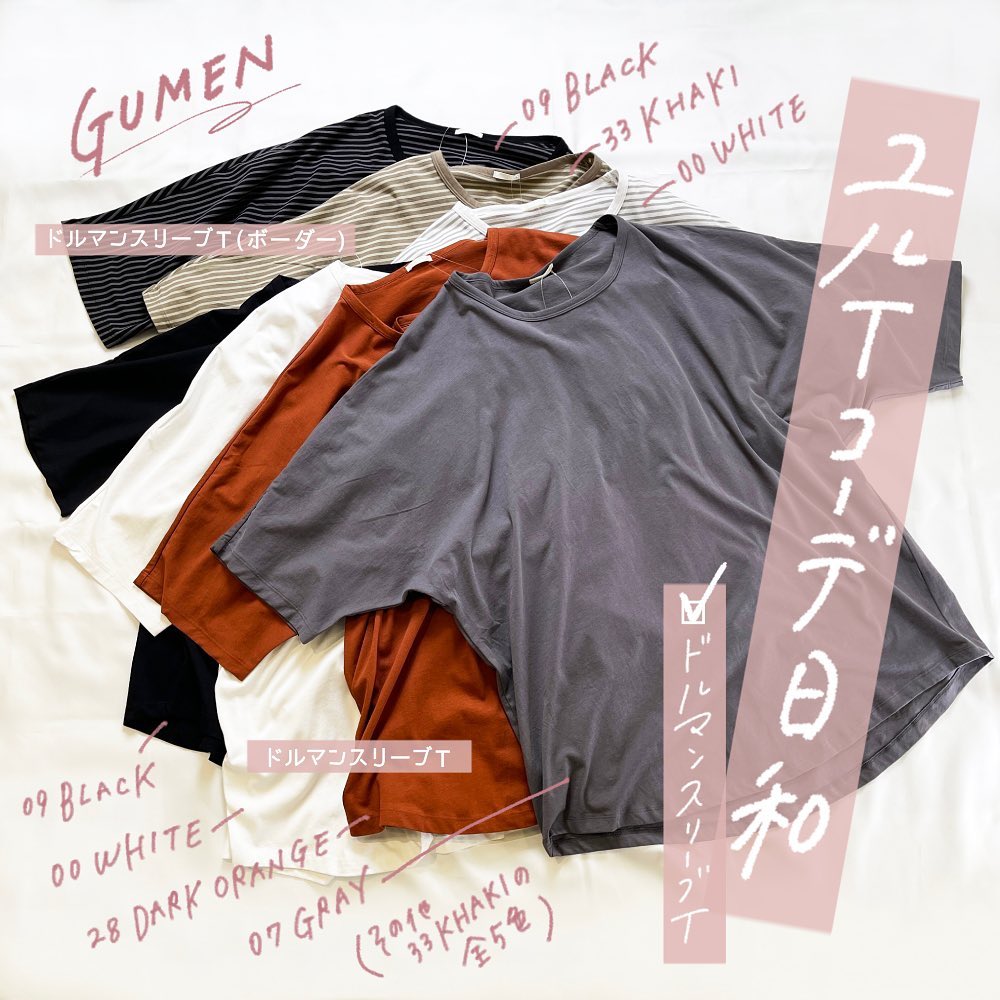 ユルTコーデ日和👍リラックスした雰囲気を味わえる、こだわりのデザイン🌟アームホールに縫い目がなく、肩を動かしやすいドルマンスリーブTシャツが、いい感じ😉
