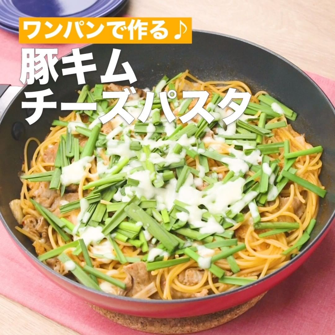 ②<ワンパンで作る♪豚キムチーズパスタ>