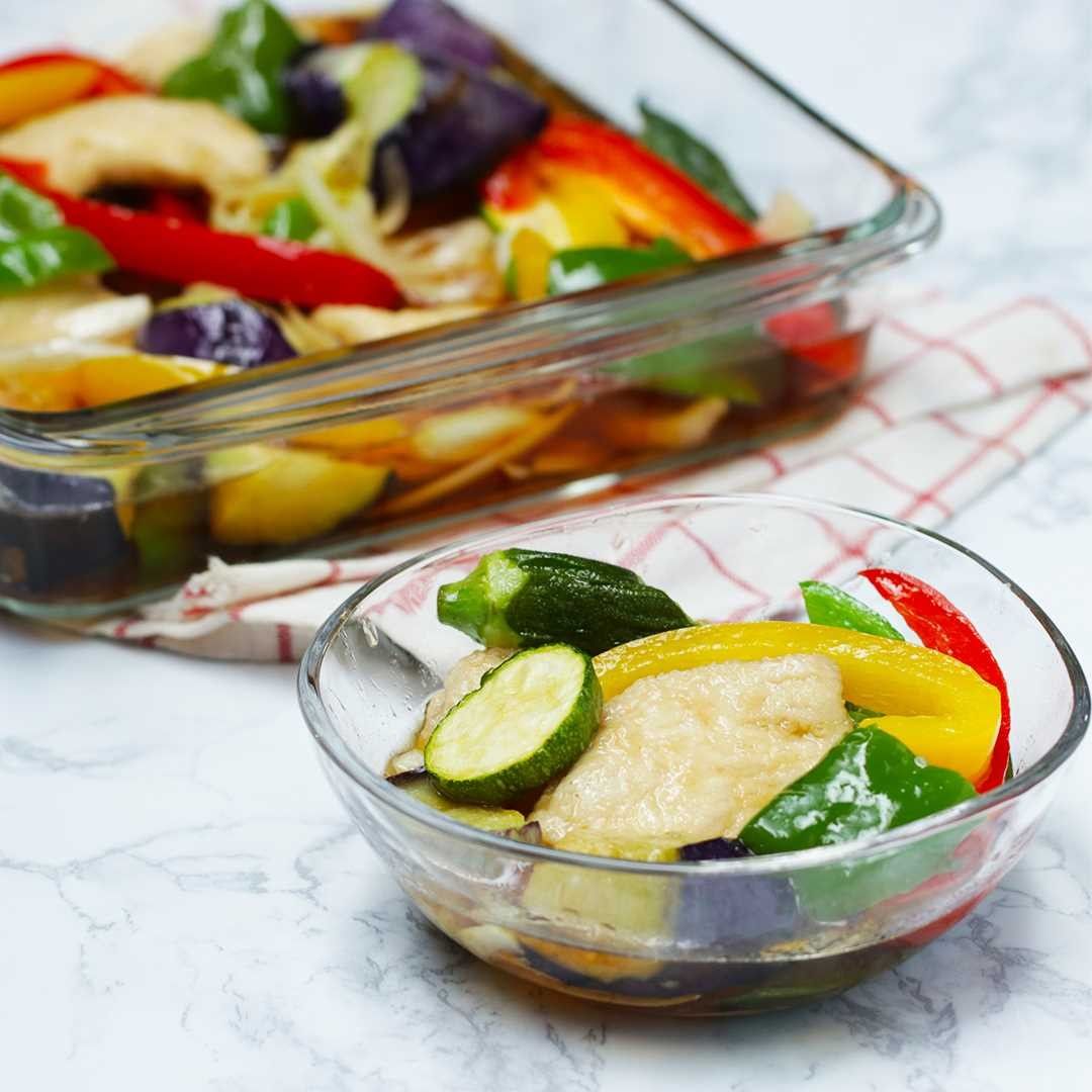 1. Remove the stem off eggplants and okra. Cut eggplants into small pieces. Cut okura into halves. Slice red and yellow bell peppers. Cut green pepper into bite-sized pieces.