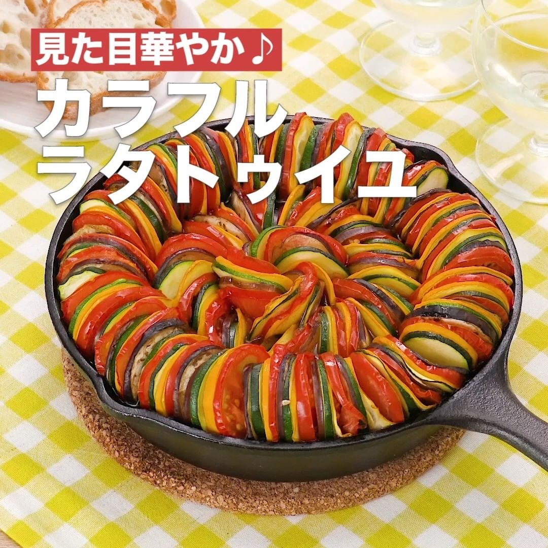 スキレットでミートソースを作り、ピザ用チーズと彩り豊かな野菜をのせてオーブンで焼きます♪綺麗に並べた野菜は旨味がぎゅっと凝縮されて、見た目も楽しめてお腹も満足できる一品です。