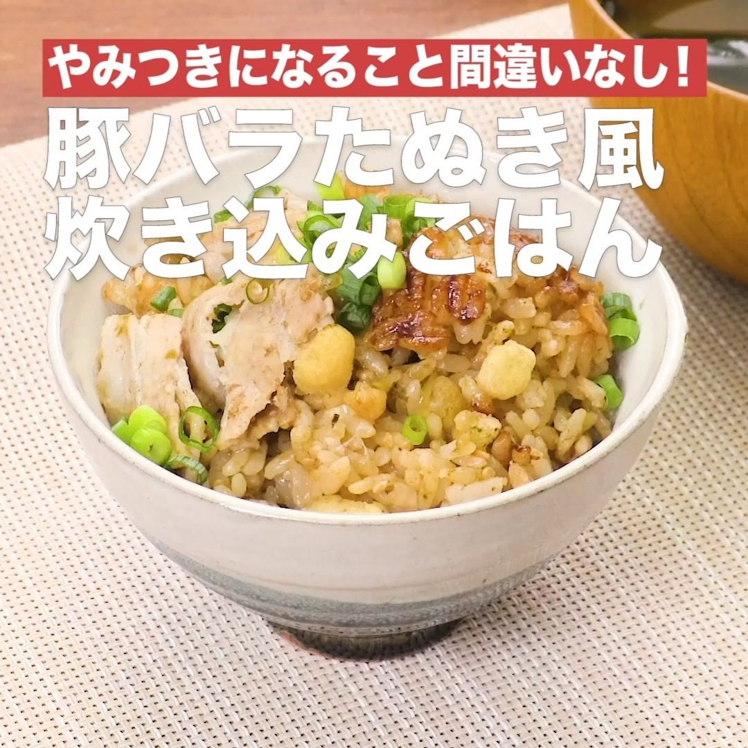 ④<やみつきになること間違いなし!豚バラたぬき風炊き込みごはん>