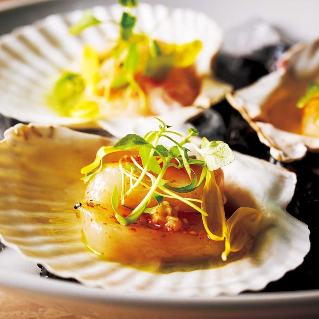 写真①▷「北海道産ホタテのセビーチェ 真紅のナムチムソース 生姜のピクルス、コリアンダー」