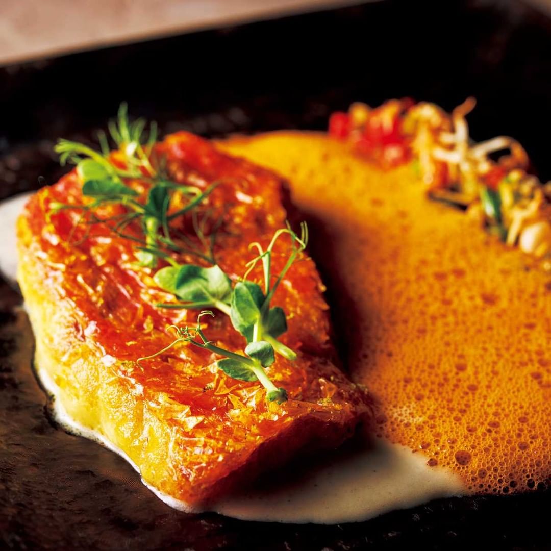写真②▷「金目鯛の鱗焼き ベジタブルレッドカレーソース、レモングラスのエマルジョン、ココナッツ」